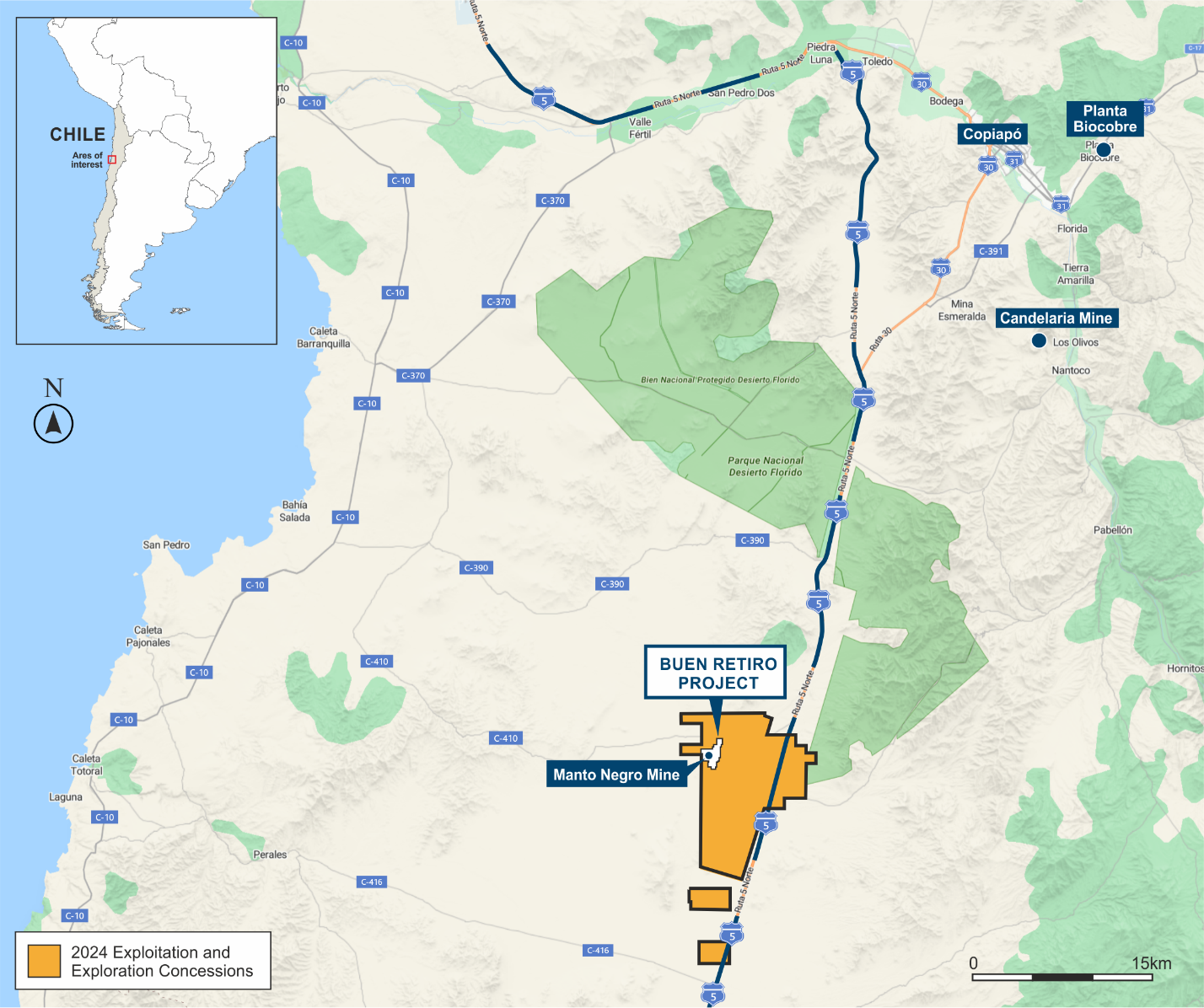 The Properties are situated close to the Candelaria deposit in the Punta del Cobre iron-oxide-copper-gold (“IOCG”) district of Copiapó, Chile. High grade copper oxide ore was mined from 2005 to 2009 at Manto Negro and trucked 60 km to a processing plant in Copiapó. The Manto Negro open pit is 43 km southwest of Candelaria, 35 km from the coast, and 5 km from the Pan American Highway and high voltage transmission lines. The Buen Retiro Project has a wealth of information, including assay data from