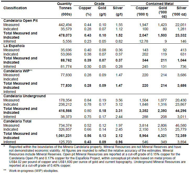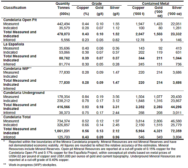 Table 1. Audited Mineral Resource Statement, Compañia Contractual Minera Candelaria, SRK Consulting (Canada) Inc., December 31, 2022 (100% Basis)