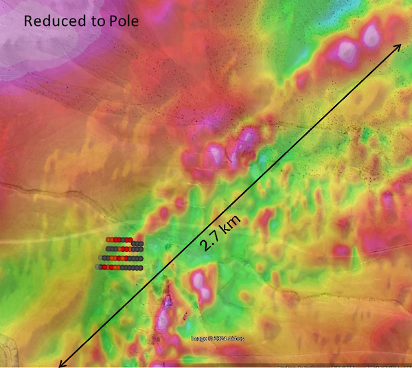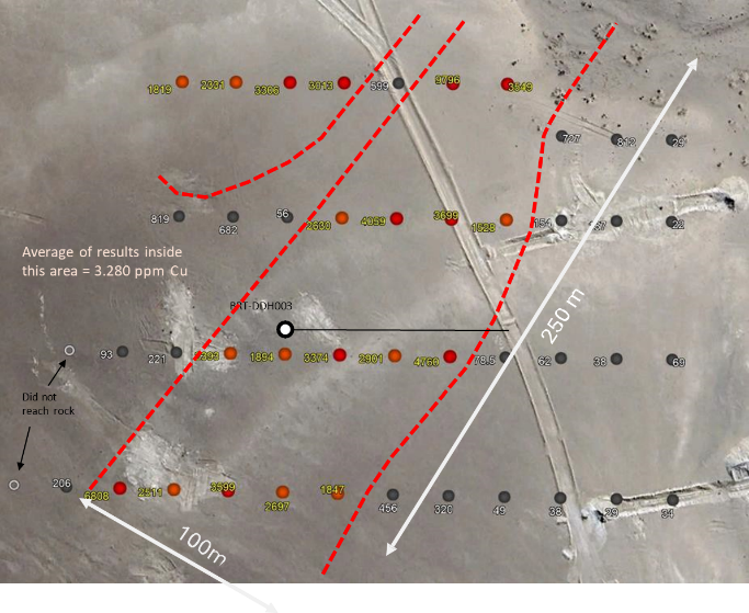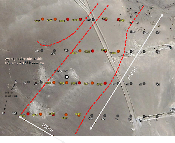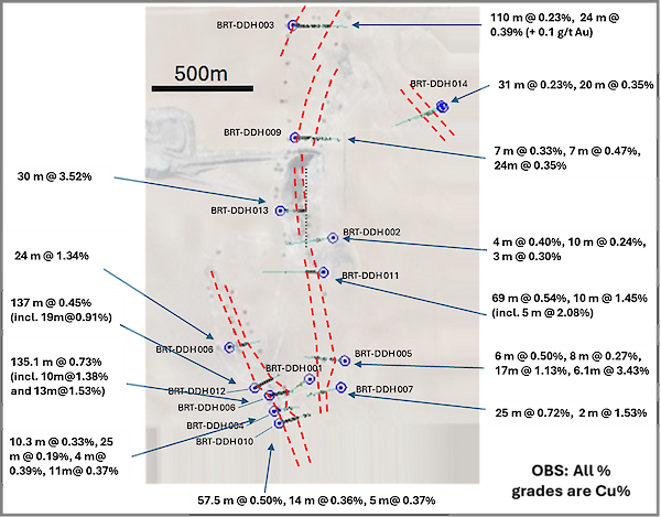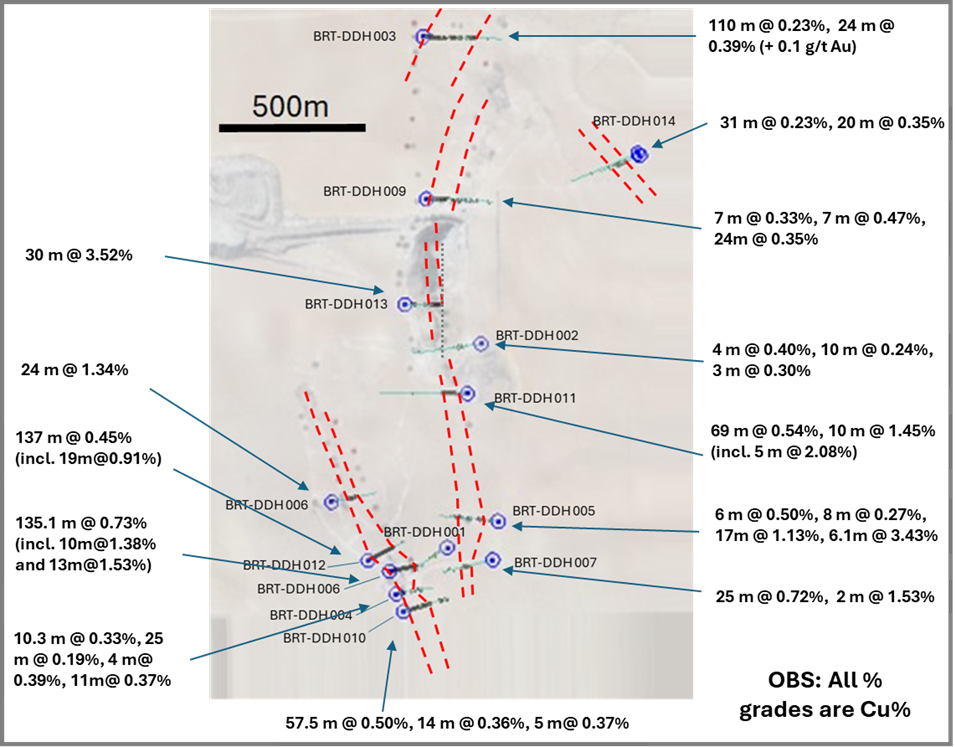 A significant north-east trend has been identified that is ready for step-out and down-dip drilling. The trend is defined by multiple anomalies. Diamond drillhole BRT-DDH03 returned 110 m @ 0.23% Cu from surface, and 21 m @ 0.41% Cu and 0.11 g/t Au, from 241 metres. In the vicinity, DTH drilling identified an area at sub-surface grading 0.32% Cu that is open along trend. This trend alone can be followed for 1,300 m along a geomorphological topographic high, for 2,100 m on an IP feature, and for 2,700 m considering magnetic anomalies (Figures 5 to 8).