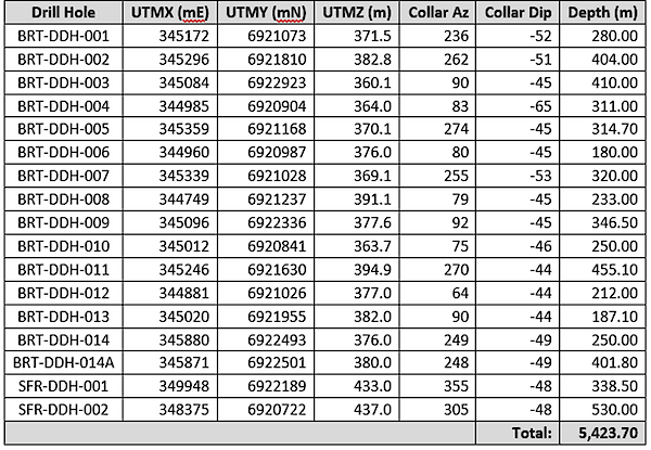 Table 4. Drillhole collar coordinates, azimuth, dip, and depth