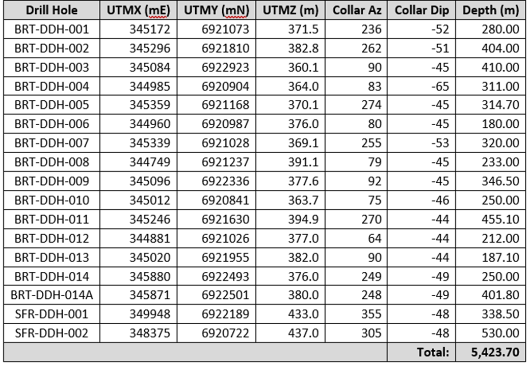 Table 3. Drill core assay results summary and location, Buen Retiro Project
