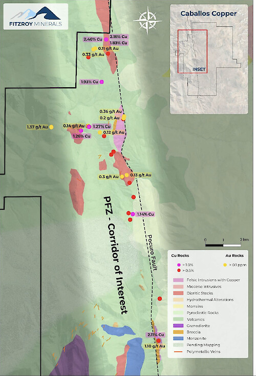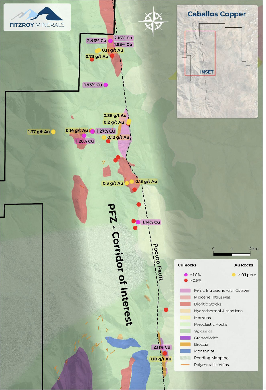 Merlin Marr-Johnson, President and CEO of Fitzroy Minerals commented, "Mapping at Caballos confirms mineralisation along the Pocuro Fault Zone corridor, highlighted by positive results and the presence of old workings. There is a clear association of copper mineralisation with felsic and dioritic intrusions in the main Pocuro Fault corridor at the Project. Three new veinlet-bearing dioritic stocks ranging from 600 to 1,300-m long were identified in the northern part of the Project. The most recent discovery of a large, copper-stained felsic intrusion and the extensive polymetallic veins sets in the southern sector are yet more signals that we are mapping out an extensive mineral system. The plan is to map out the extent of the mineralised intrusions and nearby veins that are associated with the main north-south structures.”