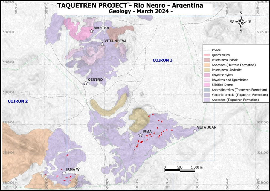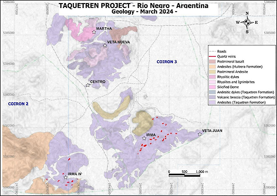 Geological reconnaissance was carried out to the southwest of Taquetren, following up on features seen in scout mapping. The work has discovered a vein system approximately three kilometres southwest of Irma. The veins have similar characteristics to those at Irma and are also hosted by the Taquetren Formation, although with a slightly higher content of disseminated sulphides. The quartz veins host pyrite and lesser arsenopyrite. The veins strike in the same NE-SW direction and dip to the NW. The veins, which do not outcrop and are largely covered with soil, are discontinuous along strike and vary in thickness between 0.30 and 1.10 metres.