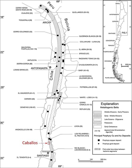 “Caballos offers a unique opportunity to explore a significant copper target that was advanced to its current drill-ready status by Vale. The project is located on the flanks of a geological belt that stretches from Antofagasta plc’s Los Pelambres mine to Anglo American’s Los Bronces copper mine. Los Pelambres and Los Bronces have endowments of 36 million and 44 million tonnes of contained copper respectively. Both operations produce over 300,000 tonnes of copper annually.