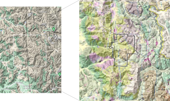 The Caballos area straddles geology of the Miocene Farellones Formation and the Oligocene Abanico Formation. Age-dating at Caballos is not conclusive, with a K-Ar radiometric date of 25.5 Ma +/- 0.7 Ma. Caballos is located over an important regional fault system, the Pocuro Fault Zone. The PFZ is a clearly visible regional-scale morphological feature that has been mapped in a N-S trend for more than 200 km (see Fig.2). The PFZ is a high-angle reverse fault (with vergence to W) and was active at least until the Early Miocene. The fault zone has been described as a 'megafault' that stands out as one of the largest geological features in the region.
