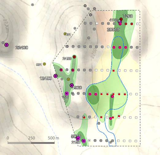 Figure 3. Caballos North, geochemical grid in Cerro Las Mulas