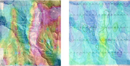 Also at Cerro Las Mulas, two different induced polarization (“IP”) surveys shows chargeability coincident with the geochemical copper anomalies. The first IP survey was a Gradient survey carried out by Quantec in 1998. The second IP survey was a dipole-dipole survey carried out by Zonge in 2006. Screen-grab images of the anomalies are shown in Figure 4, below.