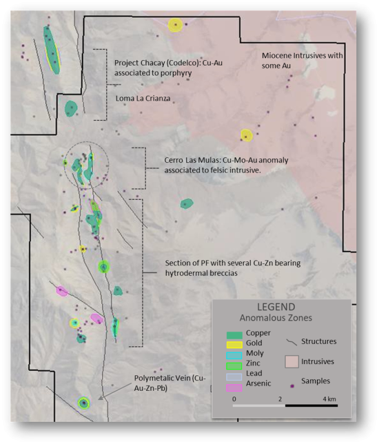 Outside of the immediate Cerro Las Mulas target area, anomalous and abundant copper is found in several zones located along over 10 km of the Pocuro Fault Zone which traverses the western portion of the property. The elevated geochemical values are mainly associated with stocks and hydrothermal breccias around the PFZ (see Figure 5, below). The central and southern part of the PFZ host several hydrothermal breccias with copper, zinc, and locally molybdenum. The average copper grade of all samples taken to date across the property is 850 ppm Cu.