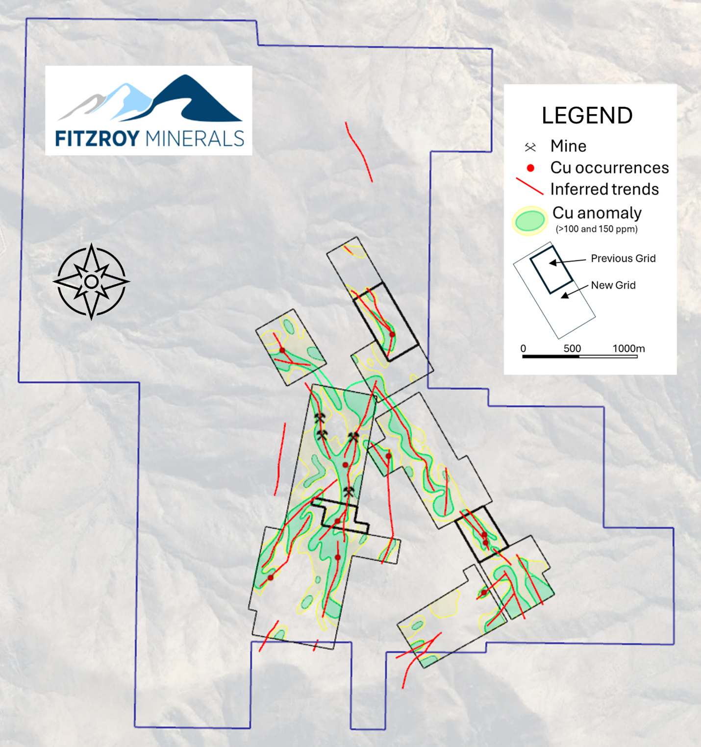VANCOUVER, BRITISH COLUMBIA, September 12, 2024 – FITZROY MINERALS INC. (TSXV: FTZ, OTCQB: FTZFF) (“Fitzroy Minerals” or the "Company") is pleased to announce a significant expansion of the copper-in-soil anomalies at the Polimet Gold-Copper-Silver Project, Chile (the “Project” or “Polimet”). These soil geochemistry results delineate two continuous trends of 2.0 km and 1.9 km, respectively, plus a further five other anomalies 400 m to 1,000 m in length. In total, the survey delineated 6.9 km of copper anomalies, many of which are open along strike, including a 450 m wide zone with high copper concentrations at the southern end of one grid, in an area where there is no prior indication of surface mineralization. The soil survey expanded on the test grids previously reported by the Company May 14, 2024. A further soil survey is now being planned to follow up on high-potential areas. Copper is a direct mineral indicator at Polimet, which hosts a high-grade gold-copper-silver epithermal system.