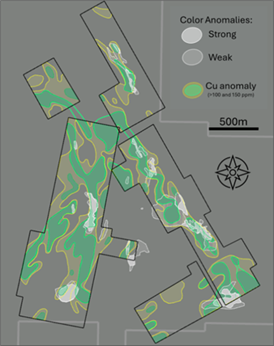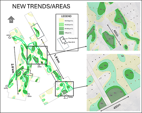 - Two continuous trends of copper-in-soil anomalies identified, each approximately 2 km-long.