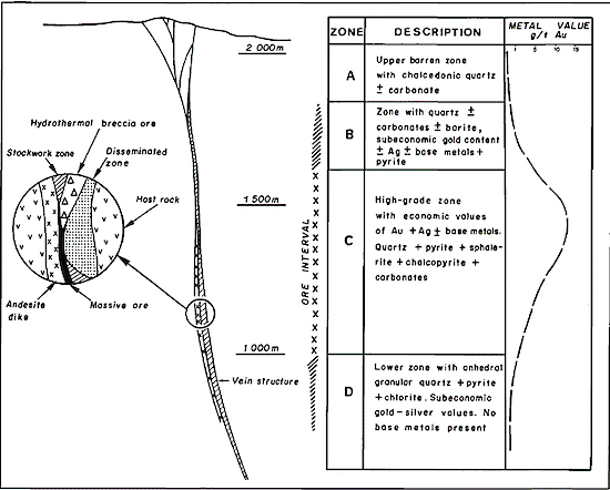 Camus et al. (1991), write that four mineral zones can be recognized in typical ore shoots at El Bronce (Figure 5). The uppermost Zone A is characterized by stockwork zones with veinlets filled with barren chalcedonic quartz and carbonates. Zone B consists of quartz, barite, carbonates, pyrite, base metals, and sub-economic gold and silver. Zone C consists of quartz, pyrite, sphalerite, chalcopyrite, carbonates, and economic values of gold and silver. Zone D is a lower zone with sub-economic gold and silver values, and no base metals present.