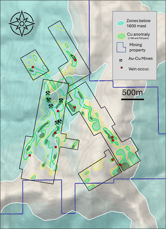 The soil survey carried out by Fitzroy Minerals covers an elevation range from 1,350 m to 1,950 m above sea level. In general, the area to the northwest is at lower elevation and the higher elevations are in the central and southern areas. Figure 6 shows the survey area, with the 1,600 m contour marked in white, and elevations below 1,600 m highlighted in blue green. Fitzroy Minerals notes that the old gold workings (located within the red circle) are at elevations just under 1,600 m and that there are important copper anomalies at elevations above 1,600 metres. The open anomaly in the south, for example, is at a height of approximately 1,700 metres.