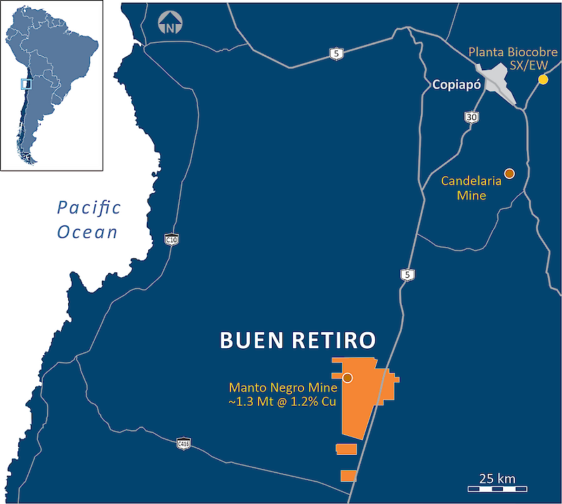 The Properties are situated close to the Candelaria deposit in the Punta del Cobre iron-oxide-copper-gold (“IOCG”) district of Copiapó, Chile. High grade copper oxide ore was mined from 2005 to 2009 at Manto Negro and trucked 60 km to a processing plant in Copiapó. The Manto Negro open pit is 43 km southwest of Candelaria, 35 km from the coast, and 5 km from the Pan American Highway and high voltage transmission lines. The Buen Retiro Project has a wealth of information, including assay data from